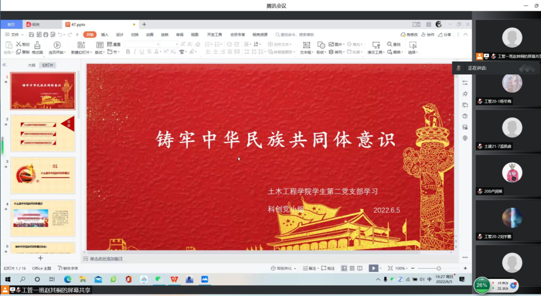 2022年6月5日19:30,9001cc金沙以诚为本学生第二党支部通过腾讯会议开展了以“铸牢中华民族共同体意识”为主题的党小组学习。参加本次学习的有二支部科创党小组、宣传党小组、活动党小组、学习党小组的全体党员和积极分子。