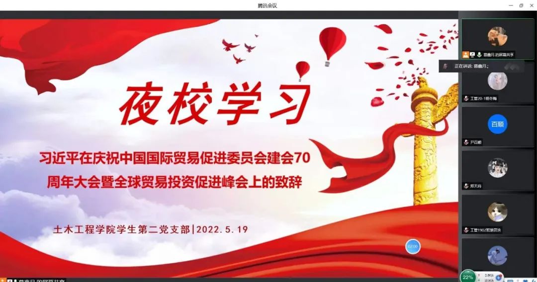 2022年5月19日21:00,9001cc金沙以诚为本学生第二党支部通过腾讯会议开展了以“习近平在庆祝中国国际贸易促进委员会建会70周年大会及全球贸易投资促进峰会上的致辞”为主题的线上学习。本次学习的主持人为党员葛鑫月同志,参加本次学习的有二支部全体党员。