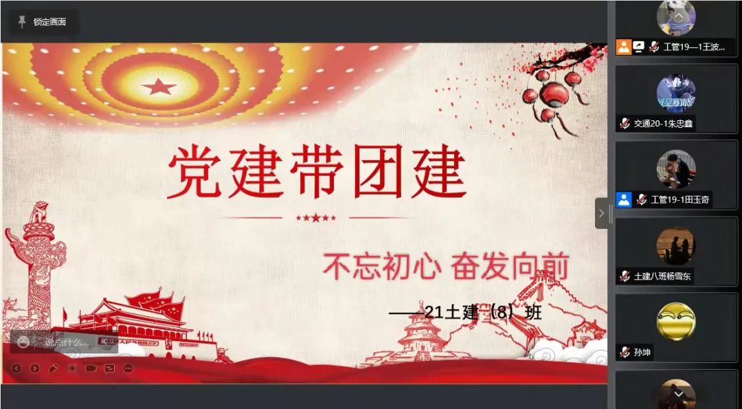 2022年4月,9001cc金沙以诚为本学生第二党支部在管科、土建团支部组织开展了以“不忘初心,奋发向前”为主题的“党建带团建”活动。其中,4月21日15:00,党员杨佳慧、郭鑫同志于腾讯会议为21级管理二班团支部开展此项活动;4月22日16:30,党员田玉奇、王波同志于腾讯会议为21级土建八班团支部开展此项活动。