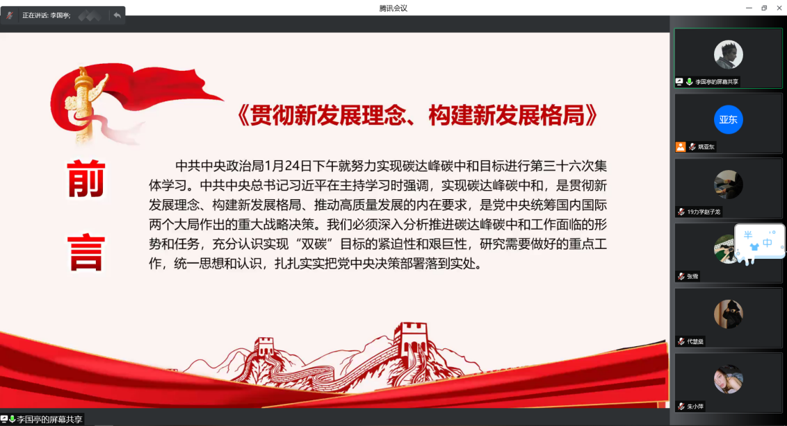 大会第一项,由李国亭同志进行第一议题学习,本次学习内容为习近平主持中共中央政治局第三十六次集体学习,以视频的方式展开,主要介绍以下三点内容: