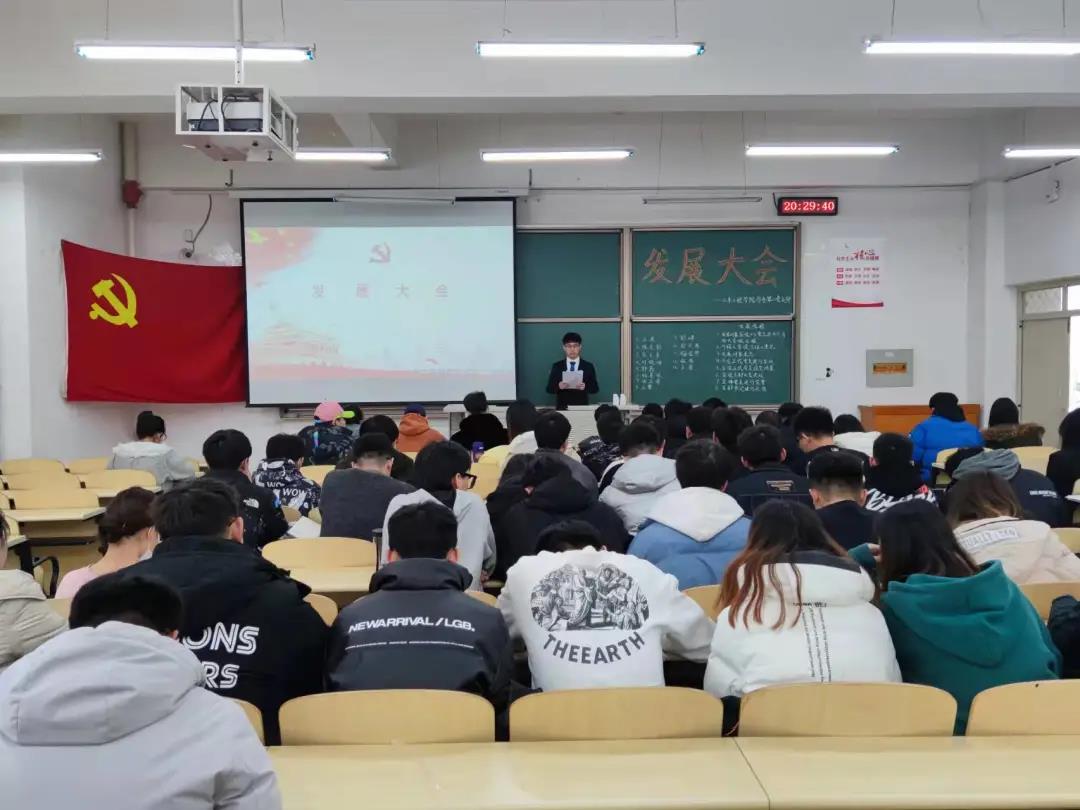 2021年12月9日12:30,9001cc金沙以诚为本学生第二党支部在逸夫楼G103召开了发展大会,参加本次会议的有支部书记杨明明老师、支部负责老师王潇潇老师、支部全体党员和部分积极分子。本次会议由党员荣颖蕤同志主持。