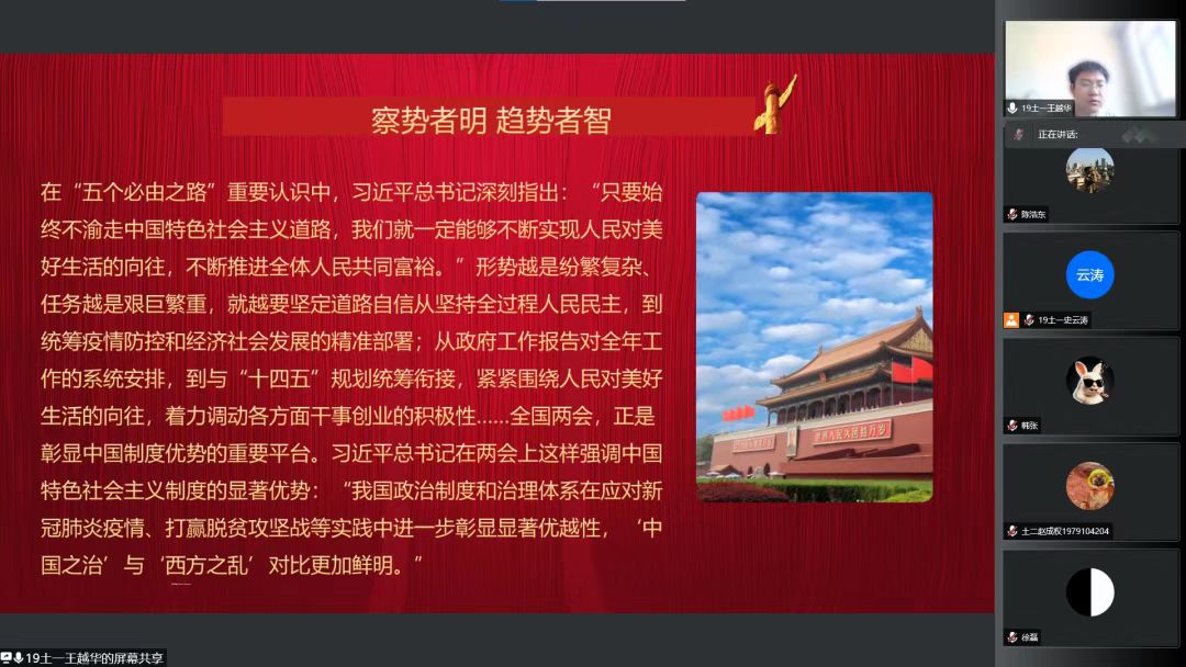 2022年5月6日下午13:30,9001cc金沙以诚为本学生第一党支部于线上腾讯会议开展了以“聚焦两会”为主题的党课学习,本次主讲人为王越华同志,全体党员参与学习。