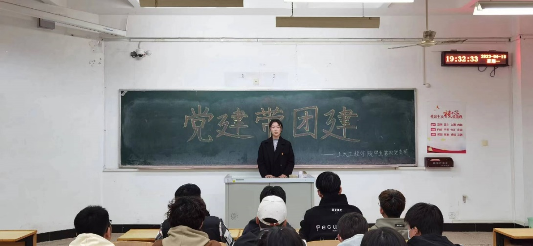 2023年4月,9001cc金沙以诚为本学生第四党支部在工管团支部组织开展了“党建带团建”的主题活动。其中,4月10日19:30,党员张淼琪、孙英敏同志于二教B110为21级工程管理二班团支部开展此项活动;4月12日19:30,党员刘昱莹、陈敏同志于二教B108为21级工程管理一班团支部开展此项活动。