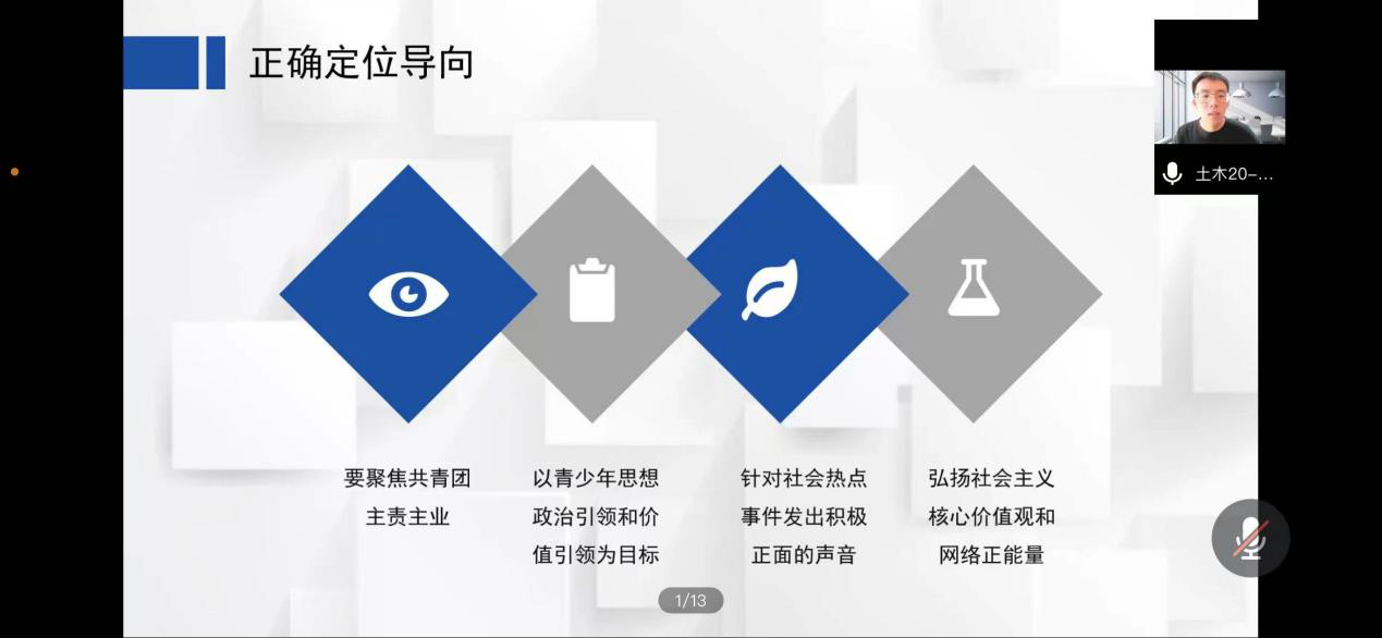土木20-2班刘靖同学为我们讲解的主题是“共青团网络新媒体中的内容生产制作规范”。从“找准内容定向导向”、“规范内容设计标准”、“加强产品原创力度”三方面展开详细讲解,健全网络新媒体宣传工作机制,在网络新媒体宣传日常管理、激励评价、骨干培养、资源保障和整合等方面建立一整套有效的机制,将为持续深入开展网络新媒体宣传引导工作提供机制保障。