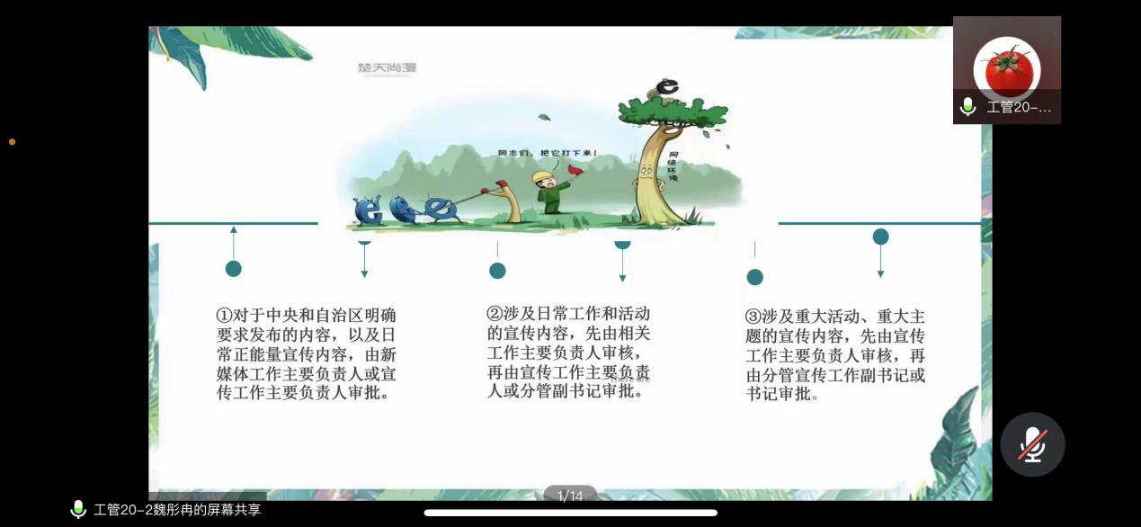 工管20-2班为魏彤冉讲解的内容是“网络新媒体内容审核发布流程”。互联网是虚拟空间,每个人都应该知法、懂法、守法、护法,以事实为依据,以法律为准绳。重点讲解到我们在新媒体发布是要严格履行编审操作流程,严格执行发布审批程序进而确保网络安全管理,同时,我们必须提高自身的防范意识,注意保护隐私信息,认真分析计算机网络安全问题,有针对性采取解决措施。