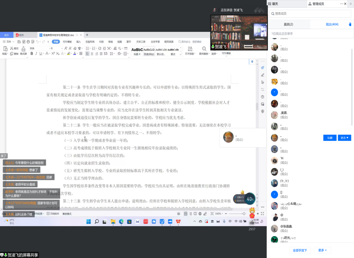 9月8日下午16:00,贺凌飞老师组织新生学习《学生管理规定》、《学籍管理规定》、《学生违纪处分办法》等学校的规章制度,帮助同学们了解国家有关法律、政策法规和校纪校规。在给予纪律处分的情形、原则以及若干问题上进行了精确的讲解,还就学生受纪律处分的比例、种类、原因等方面作出细致入微的分析。最后贺凌飞老师希望同学们能够享受大学的精彩生活,为将来踏入社会做准备,希望本次讲座帮助大家对大学生活有更明确的目标和规划。