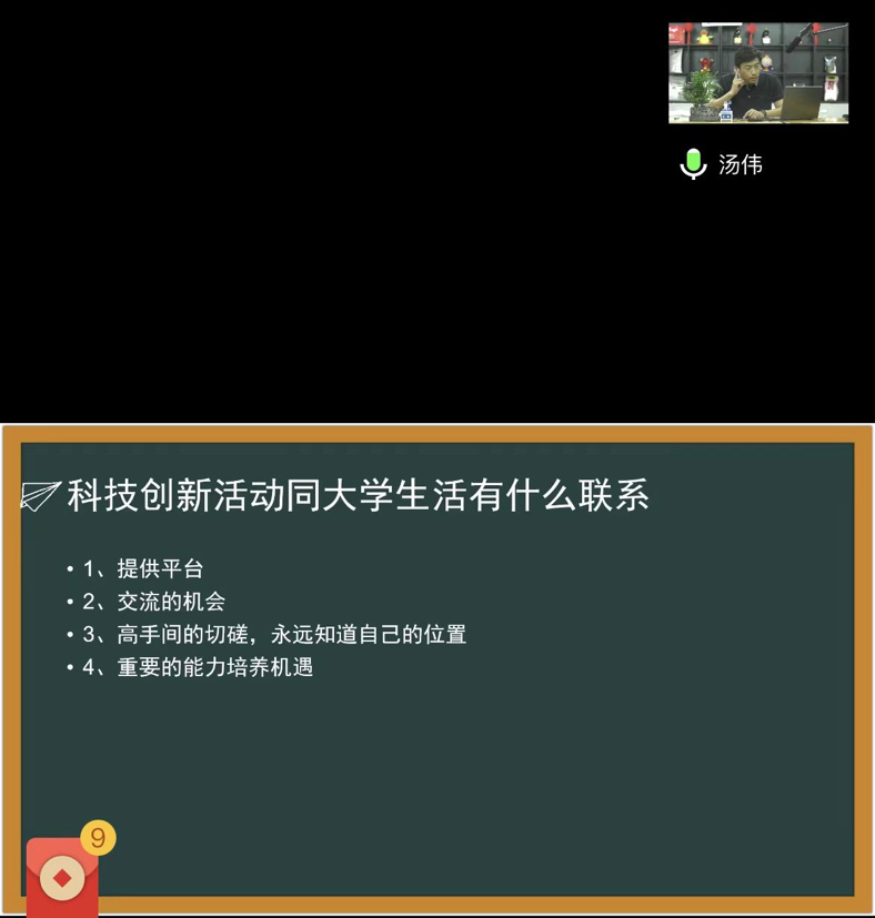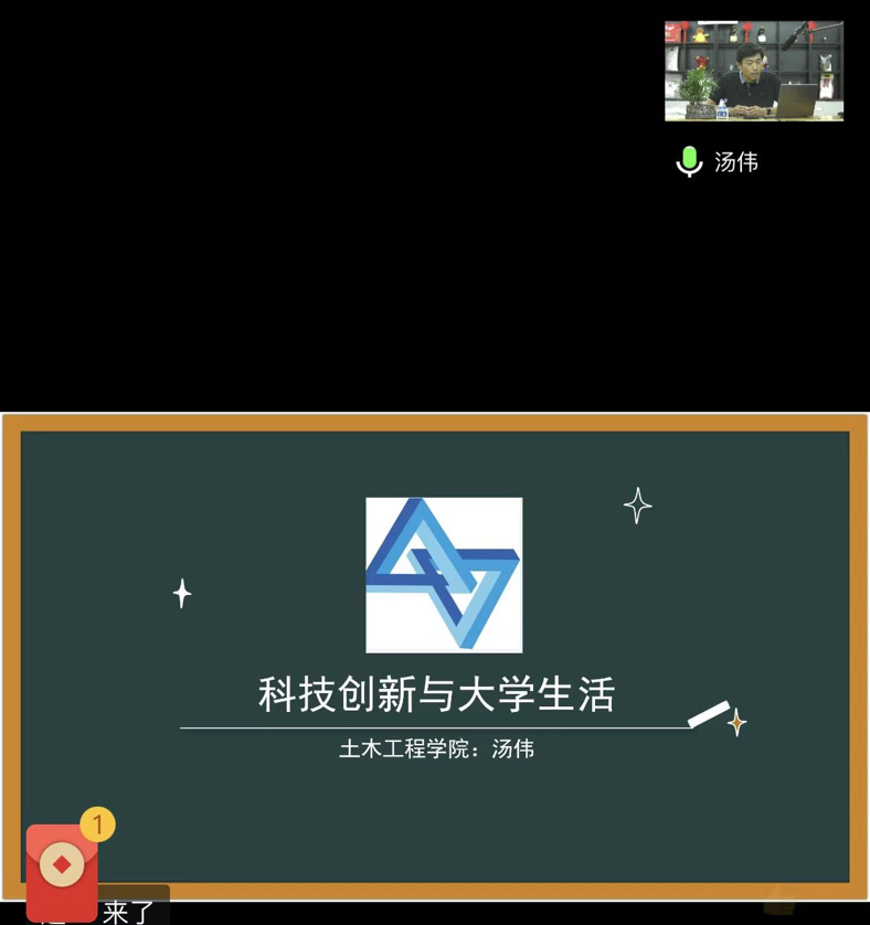 9月6日晚19:00,汤伟老师就大学生科技创新为主题为2022级新生进行详尽细致的讲解。汤老师说,进入21世纪人才毫无疑问将成为时代发展与社会进步的主导因素,想要成为为一名优秀人才,科技创新能力是其必备的素质。汤老师希望各位新生能积极培养创新意识和创新思维,多参加科技创新活动,进而成为科技创新型人才,为祖国的建设添砖加瓦。