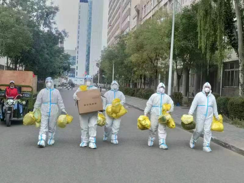 部分教师和学生志愿者在抗疫后方清理医废暂存点的医疗废物,用严谨细致的工作态度和果断坚决的实际行动践行初心使命、诠释责任担当,用实际行动书写抗疫的无悔和青春的靓丽。