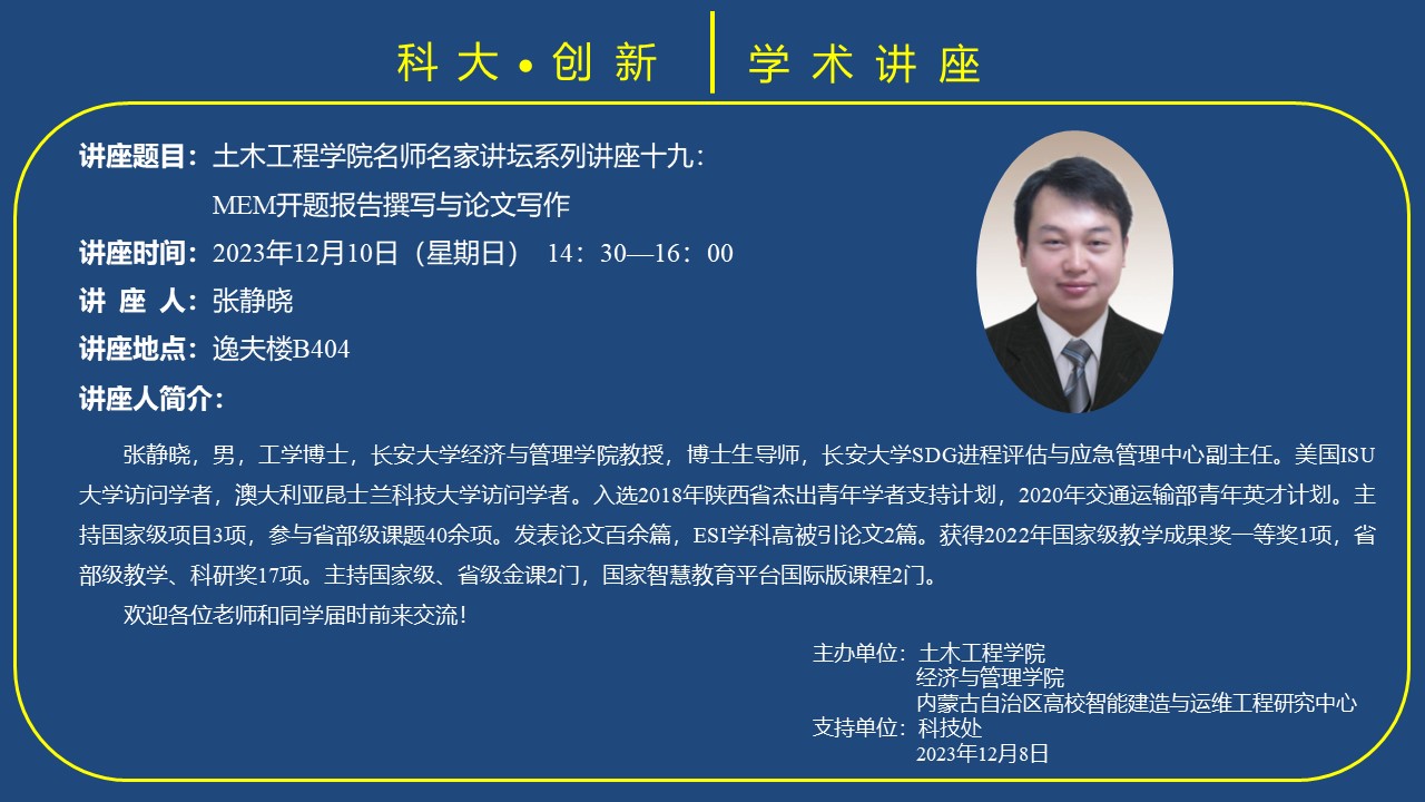 张静晓,男,工学博士(后),长安大学经济与管理学院教授,博士生导师,长安大学SDG进程评估与应急管理中心副主任。美国ISU大学访问学者,澳大利亚昆士兰科技大学访问学者。入选2018年陕西省杰出青年学者支持计划,2020交通运输部青年英才计划。主持国家级项目3项,参与省部级课题40余项。发表论文百余篇,ESI学科高被引论文2篇。获得2022年国家级教学成果奖一等奖1项,省部级教学、科研奖17项。主持国家级、省级金课2门,国家智慧教育平台国际版课程2门。