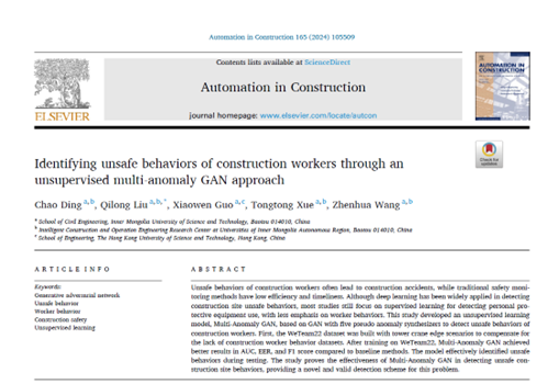 近日,建筑工程信息化领域的国际顶级期刊《Automation in Construction》(建造自动化)正式刊登我院丁超副教授学术成果“Identifying unsafe behaviors of construction workers through an unsupervised multi-anomaly GAN approach”(基于无监督多异常GAN方法识别建筑工人的不安全行为)。丁超副教授为论文第一作者,硕士生刘祺龙为论文第二作者及通讯作者,郭晓文讲师为第三作者,硕士生薛童童为第四作者,王振华讲师为第五作者。论文第一单位为9001cc金沙以诚为本和内蒙古自治区高校智能建造与运维工程研究中心。
