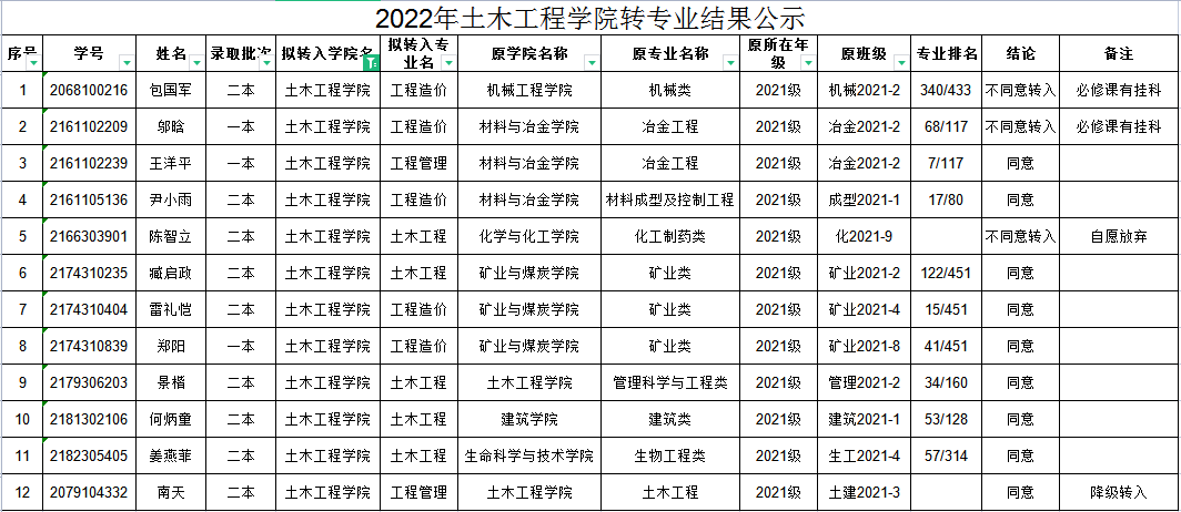 经9001cc金沙以诚为本转专业工作考核领导小组对拟转入学生进行资格审核,党政联席会上会通过,确定转入学生名单,结果公示如下: