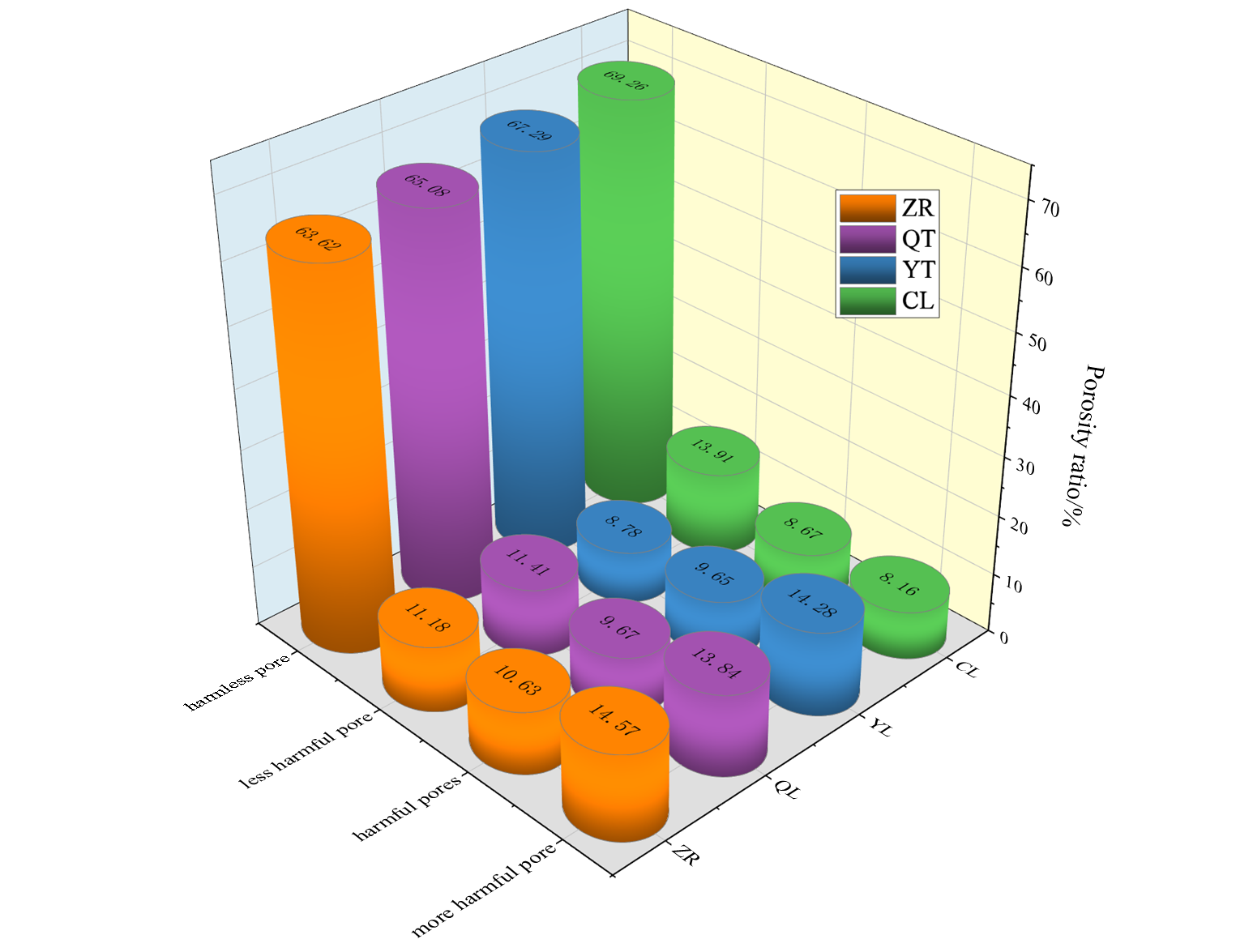 该研究发现,随着CO2相态的变化(气态、液态、超临界态),混凝土峰值强度、弹性模量及耐蚀系数呈增长趋势。气态、液态、超临界态CO2浸泡下混凝土试件总能量和耗散能呈现增长趋势,弹性能峰值呈减小趋势,其塑性变形能力变大,混凝土破坏机制由“脆性破坏”向“延性破坏”转变。CO2浸泡后的混凝土试件总孔隙率均低于未浸泡混凝土试件的总孔隙率,且在超临界态CO2浸泡下混凝土的总孔隙率最小,混凝土的密实度与抗渗透性得到了显著提高。随着CO2相态的变化(QT→YT→CL),混凝土小孔隙分形维数逐渐减小,小孔隙结构变得更为单一,而大孔隙分形维数则呈增长趋势,大孔隙形状和分布更为复杂。