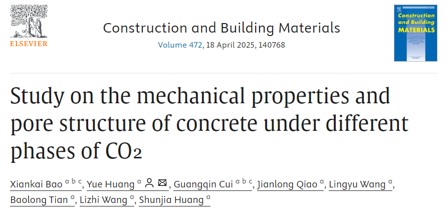 近日,9001cc金沙以诚为本岩土体力学特性与支护新技术团队鲍先凯副教授在Construction and Building Materials期刊(IF=7.4,中科院1区TOP)发表题为“Study on the mechanical properties and pore structure of concrete under different phases of CO2”(DOI: 10.1016/j.conbuildmat.2025.140768)的研究成果。该研究系统揭示了不同相态CO2对混凝土力学性能与孔隙结构的影响机制,研究发现,超临界CO2因其高渗透性及反应活性,可显著提升混凝土的峰值强度、弹性模量及耐蚀系数,通过核磁共振和分形维数分析证实其优化孔隙结构的作用,该成果为废弃矿井CO2封存设施的材料选型、结构耐久性评估提供了关键理论与数据支撑,推动了CCUS技术从地质封存向材料-环境协同优化的跨越式发展。