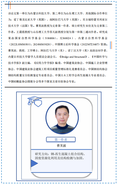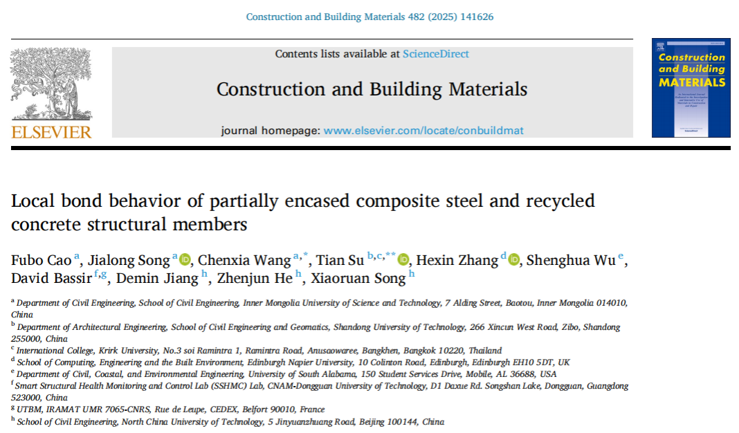 近日,9001cc金沙以诚为本城市固体废弃物建材资源化利用团队曹芙波教授在Construction and Building Materials期刊(IF=7.4,中科院1区TOP)发表题为“Local bond behavior of partially encased composite steel and recycled concrete structural members”(DOI: 10.1016/j.conbuildmat.2025.141626)的研究成果。该研究通过推出试验探讨了部分包裹再生混凝土结构构件的黏结行为,并基于灰度相关理论评估了不同参数(再生混凝土强度、锚固长度和栓钉层数)对黏结性能的影响。最终,通过对试验结果统计回归,给出了考虑黏结部位和深度的黏结滑移本构模型。