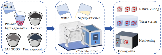 水泥工业具有高能耗、高二氧化碳排放的显著特点。每生产一吨水泥,大约排放900公斤二氧化碳。因此,水泥行业面临着大规模生产和碳减排的双重压力。轻骨料是具有多孔结构的低密度矿物颗粒,其低密度和多孔结构,已被广泛用于取代混凝土中的天然骨料,以减轻建筑重量。利用固体废物粉末生产人工冷粘结轻骨料已被认为是以较低能耗回收和再利用它们的理想途径。利用这些固体废物,降低生产成本,并有助于碳减排任务,可以产生显著的环境和经济效益,近年来受到学术界的广泛关注。目前,大部分研究利用宏观试验,探究不同骨料制备的轻骨料混凝土的力学性能,缺乏宏观层面和微观层面相结合对材料各相物理力学性能的系统分析,并对各参数之间建立定性定量关系,构建预测模型。为解决骨料短缺和赤泥、电石渣等大量堆存的问题,作者在前期的研究中,利用二者的碱协同作用,激发粉煤灰-矿渣,制备了两类人造冷粘结轻骨料。在此基础上,作者尝试利用这种轻骨料制备低碳轻骨料混凝土,系统研究其立方体抗压、轴心抗压、抗拉、抗折等基本力学性能,建立各项力学性能、超声波脉冲速度与标准抗压强度之间的定量关系,并对低碳轻骨料混凝土内部界面区进行微结构表征,为推广和扩大其工程应用奠定理论和技术基础。
