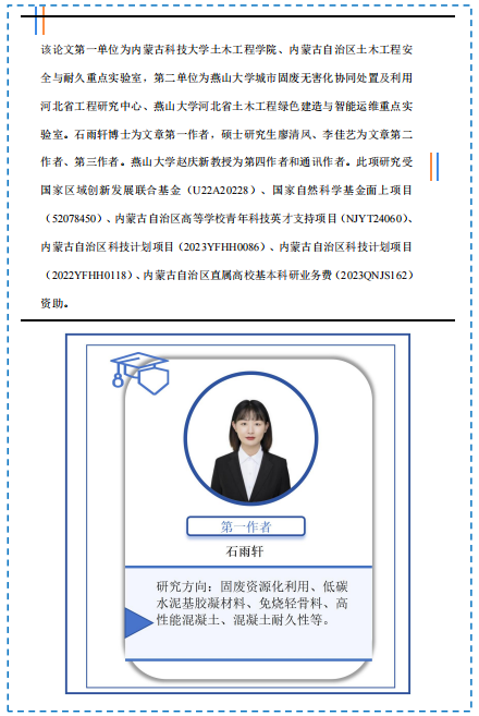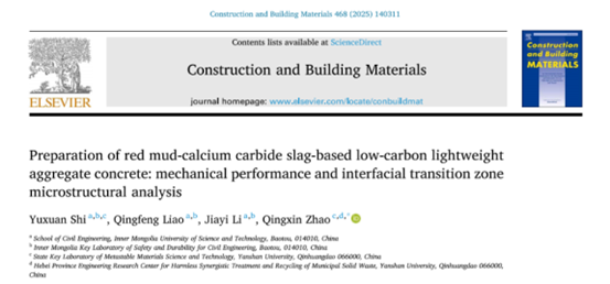 近日,9001cc金沙以诚为本城市固体废弃物建材资源化利用团队石雨轩博士在Construction and Building Materials期刊(IF=7.4,中科院1区TOP)发表题为“Preparation of red mud-calcium carbide slag-based low-carbon lightweight aggregate concrete: mechanical performance and interfacial transition zone microstructural analysis”(DOI: 10.1016/j.conbuildmat.2025.140311)的研究成果。该研究拓宽了赤泥、电石渣等工业固体废弃物的资源化利用范围,利用二者制备了低碳轻骨料混凝土,在矿物掺合料掺量、预湿时间,净水胶比、养护方式等多个因素影响下,研究低碳轻骨料混凝土的力学性能发展规律,建立超声脉冲速度与抗压强度的定量关系,并对其界面过渡区的微结构进行分析。