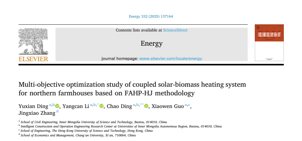 近日,9001cc金沙以诚为本智能建造与绿色可持续发展研究团队丁玉贤讲师在Energy期刊(IF=9,中科院1区TOP)发表题为“Multi-objective optimization study of coupled solar-biomass heating system for northern farmhouses based on FAHP-HJ methodology”(DOI: 10.1016/j.energy.2025.137164)的研究成果。该研究促进了可再生能源在建筑领域的推广应用,通过农村实际案例对联合供热系统进行实验,验证了基于双能源协同供暖策略下模型的可靠性,并创新性的使用FAHP-HJ算法对系统设备参数进行多目标优化,确定了太阳能-生物质能供暖系统的最佳配置方案。最终,对优化方案的能源、经济、环境和舒适性进行多维度讨论分析,以先进的建筑采暖多目标优化方法为建筑业的节能降碳提供了一个创新而高效的解决方案。