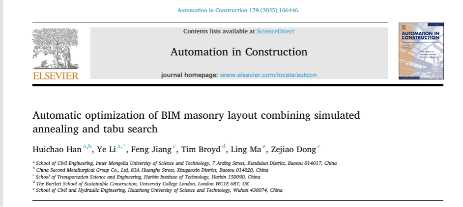 近日,9001cc金沙以诚为本工业与城市固体废弃物建材资源化利用科研团队韩慧超博士在Automation in Construction期刊(IF=9.6,中科院1区TOP)发表题为“Automatic Optimization of BIM Masonry Layout Combining Simulated Annealing and Tabu Search”(DOI:org/10.1016/j.autcon.2025.106446.)的研究成果。该研究促进了建筑信息模型(BIM)技术在建筑领域的推广应用,通过Revit内置应用程序编程接口(API)和Dynamo可视化编程以及填充墙初始信息和砌体布局信息进行协同设计,实现二次约束结构的实体创建,批量完成砖、砌块族的自动布置和参数化调整。并创新性的运用模拟退火(SA)与禁忌搜索(TS)优化算法对砌体排布进行自优化,确定了砌体填充墙(MIW)中的砌体单元(MU)和次级结构的实体模型的最佳配置方案。最终,对优化方案的前期规划、方案设计、材料采购和砌体预处理进行多维度讨论分析,以先进的砌体布局自动优化方法为建筑业的节能耗材提供了一个创新而高效的解决方案。