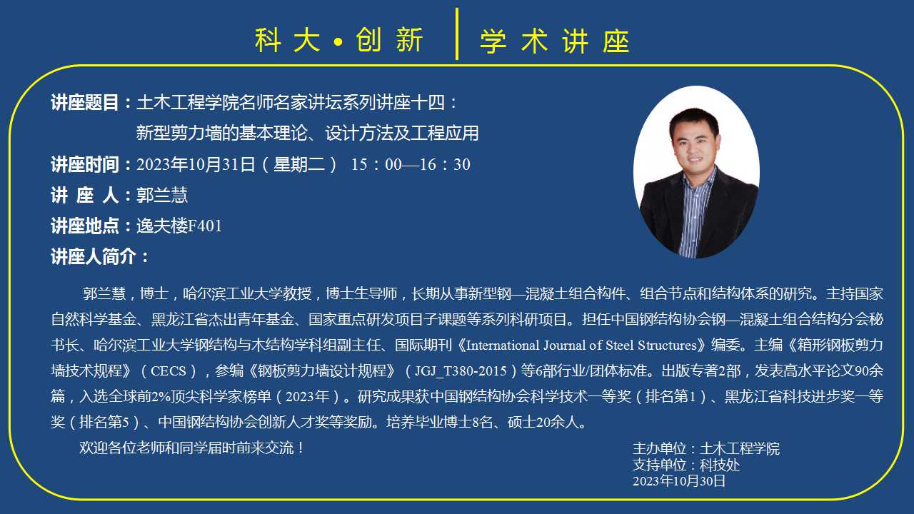 郭兰慧,博士,哈尔滨工业大学教授,博士生导师,长期从事新型钢混凝土组合构件、组合节点和结构体系的研究。主持国家自然科学基金、黑龙江省杰出青年基金、国家重点研发项目子课题等系列科研项目。担任中国钢结构协会钢—混凝土组合结构分会秘书长、哈尔滨工业大学钢结构与木结构学科组副主任国际期刊《International Journal of Steel Structures》编委。主编《箱形钢板剪力墙技术规程》(CECS),参编《钢板剪力墙设计规程》(JGJ_T380-2015)等6部行业/团体标准。出版专著2部,发表高水平论文90余篇,入选全球前2%顶尖科学家榜单(2023年)。研究成果获中国钢结构协会科学技术一等奖(排名第1)、黑龙江省科技进步一等奖(排名第5)、中国钢结构协会创新人才奖等奖励。培养毕业博士8名、硕士20余人。